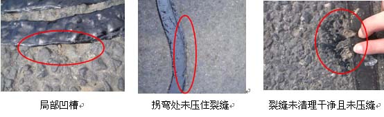在裂縫拐彎處由于追求效率未很好的密封裂縫,有些裂縫局部有較淺的凹槽較寬(而且部分凹槽有泥土,貼縫帶短時(shí)間不能與路面很好融合),導(dǎo)致單條貼縫帶不能封閉,導(dǎo)致也未進(jìn)行多條壓縫密封處理。雖糾正后大為改觀,但仍有部分裂縫未很好密封,需要專門人員檢查后修補(bǔ)。這種裂縫進(jìn)水后,很容易導(dǎo)致貼縫帶的脫落。