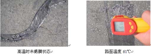 1) 在路面溫度較高時(shí)(超過(guò)60℃),由于在粘貼時(shí)用腳壓實(shí)粘腳,不能很好壓實(shí),揭掉膜后粘胎,導(dǎo)致脫落,這時(shí)不能揭膜,或者揭膜后灑上石灰粉或粒徑小于1mm的金剛砂,防止車輪碾壓脫落。
