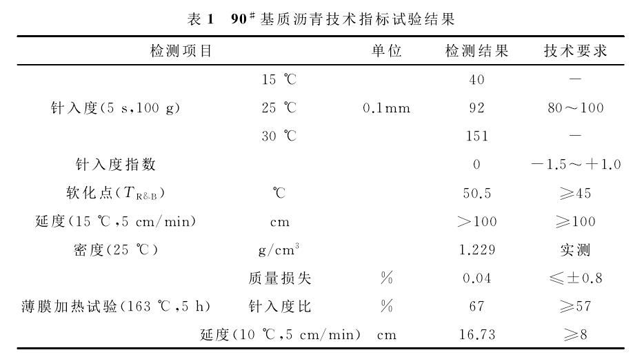 基質(zhì)瀝青品種較多,不同標(biāo)號的瀝青,其組分存在較大差異??紤]聚合物改性劑與瀝青的相容性,結(jié)合巖改瀝青性能的研究成果,該文采用中石油昆侖牌90#道路石油瀝青作為基質(zhì)瀝青。依據(jù)JTU E20-2011《公路工程瀝青及瀝青混合料試驗(yàn)規(guī)程》對90-基質(zhì)瀝青進(jìn)行相關(guān)指標(biāo)測試,試驗(yàn)結(jié)果見表1.