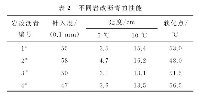 為確定巖瀝青與道路石油瀝青的匹配性,基質(zhì)瀝青選取90#道路石油瀝青,4種巖瀝青的摻量均為6%(質(zhì)量百分比),試驗(yàn)編號依次為1#(90#+6%北美巖瀝青)、2# (90# +6%布敦巖瀝青)、3# (90#+6%新疆巖瀝青)、4# (90#+6%青川巖瀝青)。采用外摻法制備巖改瀝青,對比分析針入度、延度、軟化點(diǎn)基本性能指標(biāo)(表2),重點(diǎn)通過評價(jià)其高溫性能與相容性對巖瀝青種類進(jìn)行初選。