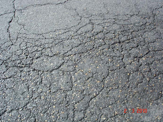 網(wǎng)狀裂縫一般是先沿著輪基出現(xiàn)單條或多條平行縱縫,之后在縱縫之間出現(xiàn)橫向或斜向裂縫而形成網(wǎng)狀裂縫??p隙寬度多為2毫米以上,縫距不大于400毫米以上。網(wǎng)狀裂縫的形成多由于瀝青混合料級配不合理,瀝青與石料配比過小使級配石料之間粘接性差而導至瀝青混凝土的強度不能滿足行車載荷的要求;另外,瀝青混凝土面層厚度不夠,交通載荷過大;面層底部穩(wěn)定層拌合不勻,密實度不足造成的。